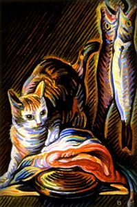 Cat with Salmon, Two Mackerel, 2004, Oil Pastel, 12" x 8", Private Collection